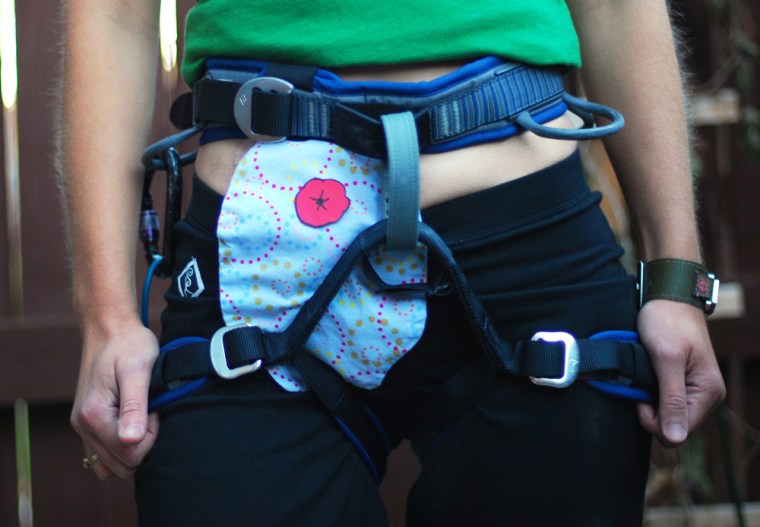 The paper cut-out shows where my stoma is. The location between the waist belt and leg loops prevents the harness from rubbing on my stoma. My belly button sits right under the waist belt.