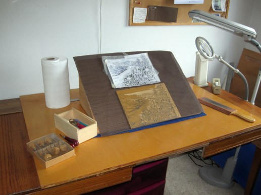 So yesterday I spent the daylight hours cleaning up my art studio. A block printing project I started before surgery sat coated in a layer of dust, and my art table had become a place to stack my boxes of wafers and pouches. Now that my space is straightened up, I am going to commit to working on art at least once a week–hopefully more.