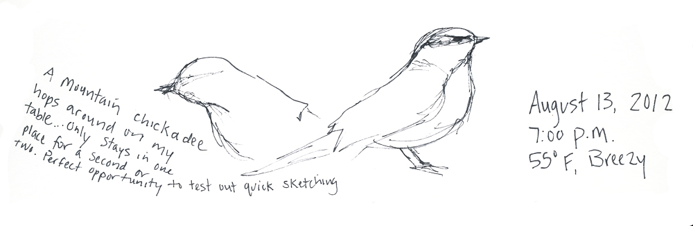 A mountain chickadee kept me company during dinner and was the perfect subject for practicing quick drawings.