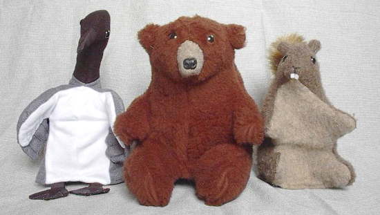 My squirrel voice was first developed for the puppet on the right, but has since been used while impersonating a variety of rodent characters. (Oh, and I also hand-sewed these three puppets.)