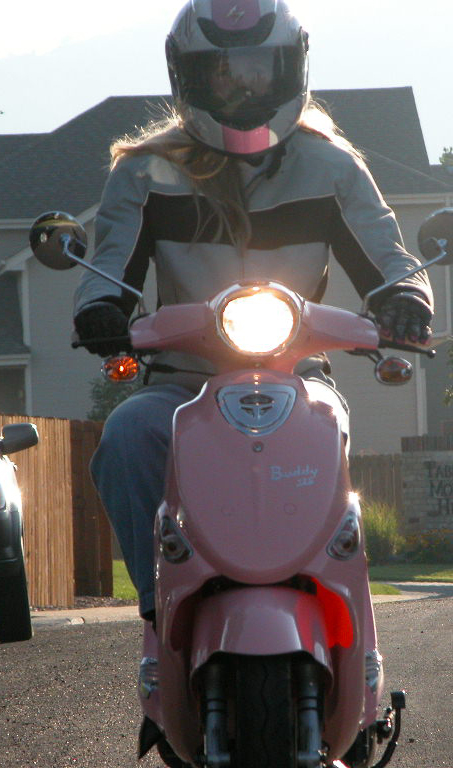 • I drive a pink scooter. In an effort to keep my carbon footprint as small as possible, I make my 28-mile round-trip commute on my scooter when the weather cooperates (my bike gets 90-95 mpg). With my pink helmet and blond ponytail, I must look like Barbie going down the street because I often get waved to by little girls.