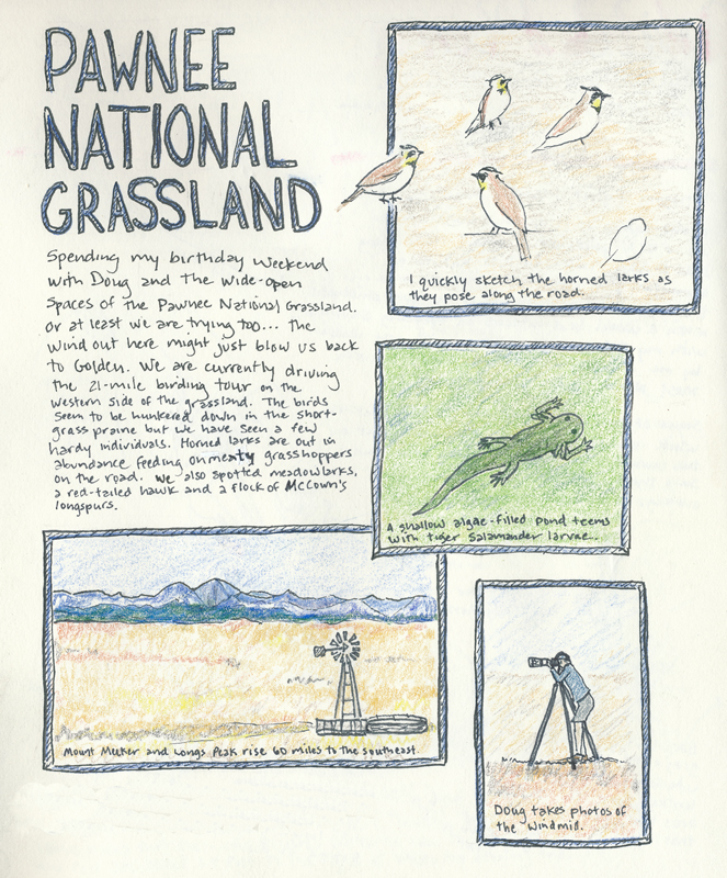 We pitched our tent, set up camp and drove the desolate dirt roads that make up the Pawnee’s 21-mile birding tour. With no agenda, we let curiosity be our guide–stopping our car and getting out to explore whenever we saw something that caught our eye. We watched horned larks and McCown’s longspurs devour huge meaty grasshoppers and a saw a green, algae-filled pond that bubbled with squirming salamander tadpoles in its soon-to-evaporate water. Doug took photos of windmills and the landscape while I stopped to sketch.