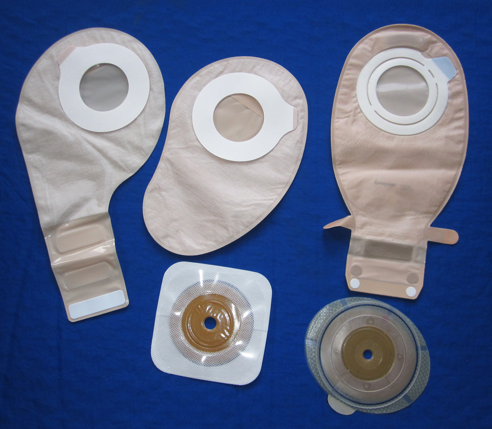 With a two-piece system, the pouches can be separated from the wafer and swapped out. On the left is a drainable pouch and on the right is a closed-end one. Pictured clockwise is a Convatec Sur-fit Natura drainable pouch with an Invisiclose tail, a closed-end pouch, and a Durahesive cut-to-fit wafer.